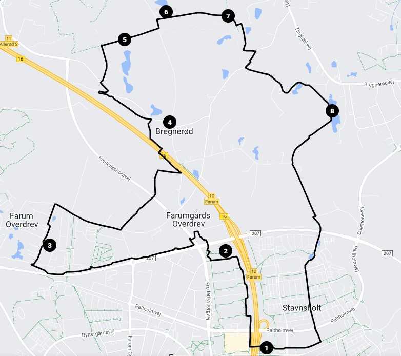 Følger du den sorte rute kommer, du ud i alle krogene af landskabet nord for Farum. Ruten er varieret, med både by, historiske bygninger, skov, søer og overdrev. Højdepunkter på ruten: • Bregnerød Kro har været et vigtigt stoppested for rejsende siden 1705, og har ligget strategisk på kongens vej mellem København og Frederiksborg slot. Der har været drevet kro frem til 2014. • Landskabet omkring Allerød Lergrav er et karakteristisk dødislandskab med bakker, søer og moser. I perioden 1870-1970 blev der udgravet ler til områdets teglværker, og noget af det gamle tipvognsspor kan i dag ses som stier. • Tivolihusene fungerede som boliger for de ansatte på teglværkerne. Det siges, at navnet opstod, fordi man hængte kulørte lamper op, når der skulle være fest. • Cobrahytten blev opført som weekendhytte af Arkitektstuderende i 1935. I 1949 blev hytten overtaget af Cobramalerne, og de dekorerede både vægge og loft. I dag er Cobrahytten revet ned, og det eneste der er tilbage er lidt mursten fra huset, et dørtrin og en brønd. Vægmalerierne er gået til, men loftet blev reddet og kan i dag ses på Sophienholm. • Rørmosen er en lille grøn perle med birkesov, vandhuller og åbne engarealer.