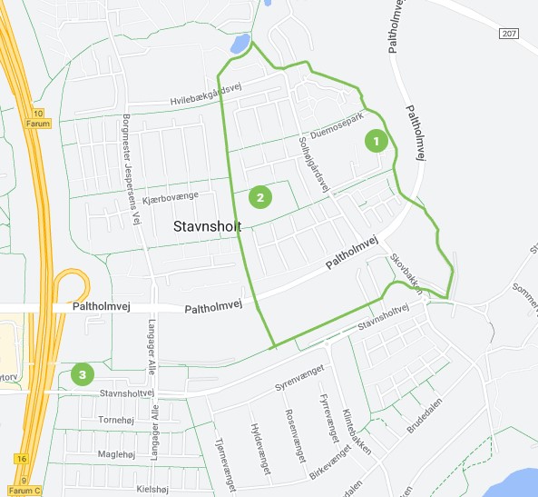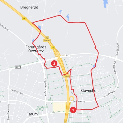 Den grønne rute tager dig på en skøn lille tur forbi det gamle Stavnsholt og skolelandbruget. Turen byder på små søer og marker, og du kommer rundt på det indre stisystem i Farum Øst med grønne områder og en legeplads. Ruten følger asfalterede stier og små veje og er egnet til gangbesværede. Højdepunkter på ruten: Du kan opleve Skolelandbruget, som drives af Furesø Kommune. Skolelandbruget tilbyder forløb for skoler og institutioner, men du er altid velkommen til at kigge ind og hilse på gårdens dyr.