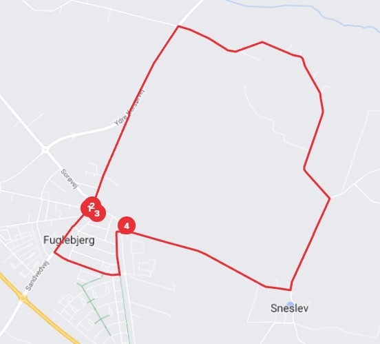 Turen gar over Fuglebjerg Torv og nordpå til Fuglebjerglund, som oprindelig var en bebyggelse af husmandssteder. Turen fortsætter gennem den lille skov Palmevænge — ingen kan forklare, hvad navnet er kommet af. Der gror ingen palmer i skoven. På den anden side af skoven gar turen videre over det vidtstrakte Sneslev Overdrev, der før udskiftningen var et fælles græsareal. Nu er området bebygget med gårde og huse. Vi kommer igennem den gamle landsby Sneslev, hvor mange af gårdene stadig ligger på deres oprindelige plads i byen. Pa vejen til Fuglebjerg ses til venstre det nye beboelseskvarter, Dyres Kvarter og Fuglebjerggård ses på højre hand.