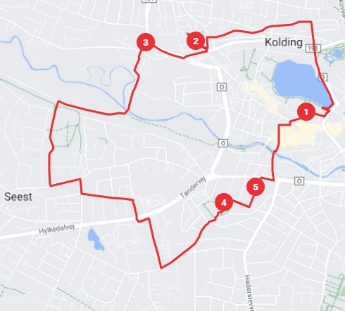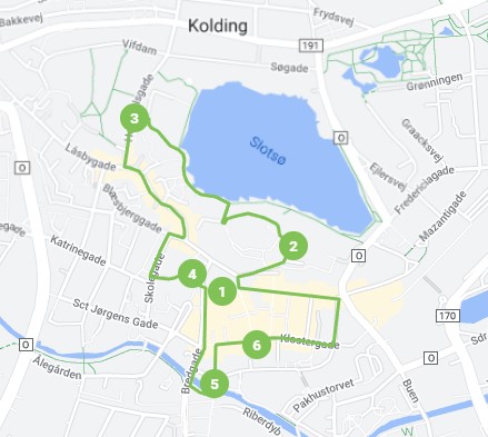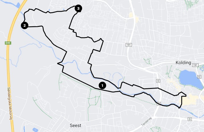 Den røde kløversti fører os op og ned i Koldings kuperede terræn og giver os nogle storslåede udsigter. Fra friarealerne omkring Koldinghus er en fin ud- sigt over Slotssøen. Ruten passerer Staldgården og Slotssøen og fører stejlt op ad Trompeterbakken. I samme niveau går vi omkring parken ”Tivolianlægget”. Fra opholdsarealet er der udsigt mod syd. Ruten fortsætter mod syd og efter vi passerer Vejlevej ses Kolding Ådal. På tværs af Ådalen stiger terrænet igen og vi kommer gennem parken ”Stejlbjerganlægget” med flot udsigt.