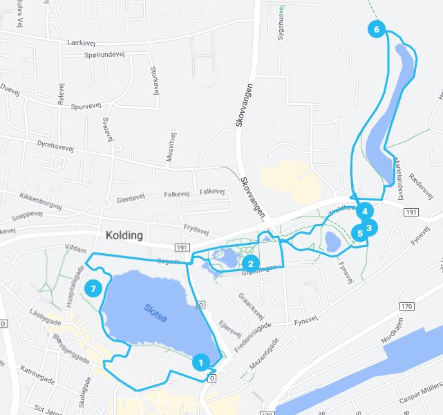 Den blå kløversti præsenterer byens grønne områder og de muligheder der er for leg og aktiviteter langs ruten. Ruten fører os langs Slotssøen og videre gennem Koldings byparker, med Legeparken, madpakkehuse og park med småsøer. Ved Troldhedebanen, den gamle jernbanestrækning, kommer vi forbi træningspavillonen, hvor der er mulighed for at træne styrke, balance og koordination samt tjekke sit kondital på Sundhedssporet. Efter en rundtur om den idylliske Marielundsøen i den velbesøgte Marielundskov går turen via Parkskolens boldbaner og legeplads og videre gennem byparkens sydlige del forbi søen og basketballbanen. Via Legeparken kommer vi til Søgade, der tidligere hed ”Bag ved Søen” og videre til Sct. Jørgens Have, der i sin tid blev anlagt med rosenterrasse. Ruten leder os tilbage til Slotssøen forbi Slotssøbadet.