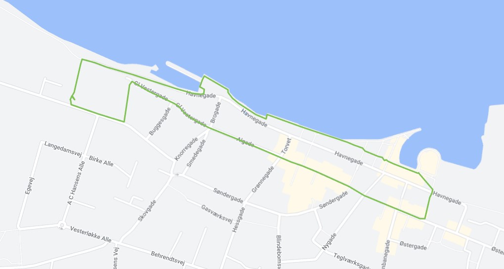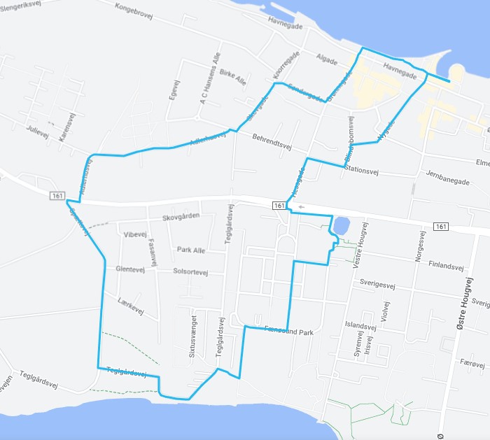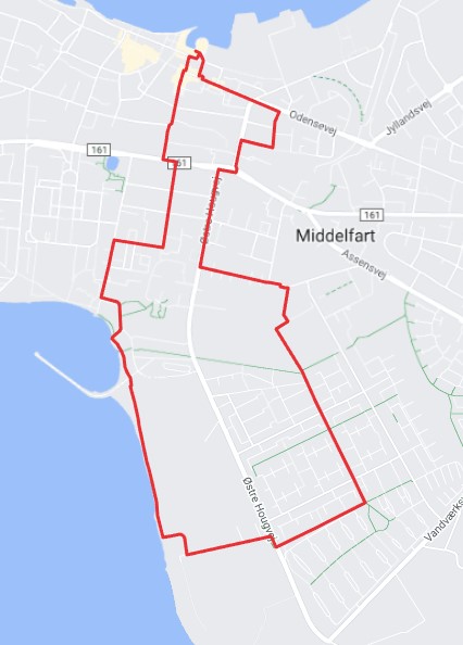 Den grønne rute tager dig igennem byens historiske hjerte. Middelfart kan oversættes til farvandet eller farten mellem Fyn og Jylland. Fra 1912 til Lillebæltsbroens ind- vielse i 1935 gik der bilfærger til Snoghøj på den anden side af bæltet. Ved havnen passeres Lillebæltværftet, som i dag drives af frivillige. På grøn rute går du forbi Grimmerhus, der har hørt un- der Hindsgavl og er bygget i 1857. I dag rummer huset Danmarks Keramikmuseum. Marsvinbrønden, der ligger i Knorregade, er opført til minde om Marsvinsjægerlauget, der fra middelalderen frem til 1892 drev jagt på marsvin i Gamborg Fjord. I Brogade ligger byens ældste private hus, Henner Friisers Hus fra omkring 1580. Huset er i dag en del af Middelfart Museum. Både på vej ud og hjem passerer ruten Middelfart Kirke, der stammer fra 1200-tallet. Den skikkelse, vi ser i dag, kan føres tilbage til midten af 1500-tallet. Til slut går du igennem Middelfarts handelsgade, som er den oprindelige hovedgade, hvor byens Østerport lå ved Holms Hotel.