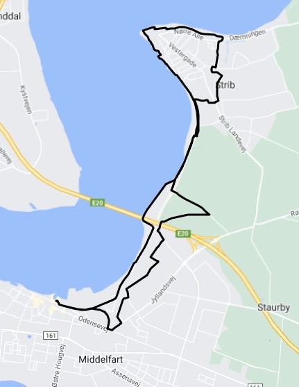 Den sorte rute går langs vandet fra Middelfart til Strib, og passerer historiske bygninger, ny bro og det gamle voldsted Søborg. På Gl. Banegårdsvej passeres de gamle Nordisk Kabel- og Trådfabrikker (NKT), der bl.a. producerede søm og ståltråd. Overfor ses ejendommen Tårnborg, som blev opført til udlejning for arbejderne på fabrikken. Ved den lille plads på Industrivej ses mod øst byens første banegård fra 1865 og mod syd en bygning, der husede Jernbanehotellet. De store krukker foran bygningerne er syrebeholdere, der tidligere blev anvendt på NKT. Den nye Lillebæltsbro åbnede i 1970 og var den første hængebro herhjemme. De to pyloner er 118 m høje og holder hovedkablerne, der er 1,5 km lange. Strib var en lille bebyggelse frem til 1866, hvor jernbanestationen og færgeforbindelsen til Fredericia åbnede. Herefter udviklede Strib sig til både stationsby og mondæn badeby med sommervillaer og badehotel. Yderst på ruten passeres voldstedet Søborg. Herfra kontrollerede man under Valdemar Sejr (1212-1241) skibstrafikken. Voldstedet bestod af en rund borgbanke omgivet af grav og volde.