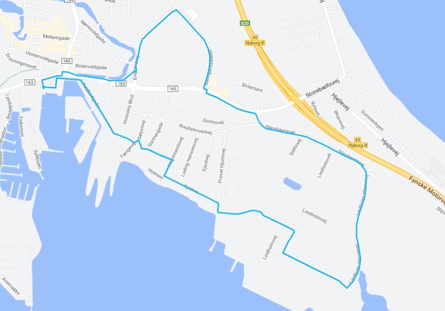 Blå sti bevæger sig gennem historien om færge-, tog- og industribyen Nyborg, der har været og stadig er et trafikalt knudepunkt for rejsende fra hele landet, hvilket har været med til at definere byens historie i mere end 800 år. For mindre end 20 år siden var det færge- og togtrafikken, som satte sit præg på Nyborg by. I dag er det stadig tog, men i høj grad også Storebæltsbroens tilstedeværelse som sætter sit aftryk på byen. Nyborg er en by i bevægelse! Stien fører dig østpå langs havnen og den gamle voldgrav hen til Chr. Hansens have, som ligger på Prins Frederiks Bastion og er en lille grøn oase midt i havne- /industrikvarteret. Herefter går turen langs den gamle stationsbygning forbi Cirkuspladsen, hen til den nye stationsbygning, som blev opført i forbindelse med opførelsen af Storebæltsbroen. På Cirkuspladsens store grønne område kan du få inspiration til motionsøvelser. Fra togstationen bliver du ledt igennem et af Nyborgs industrikvarterer og videre ud til industrihavnen. Her løber stien sammen med den sorte sti og følger den gamle kirkesti langs havnen ind mod byen. På Kirkestien kan du opleve et rigt fugleliv, og hvis du tager en afstikker ud til vandet, er der en chance for at se både marsvin og sæler. Den sidste del af turen går, forbi området med Musikskolen og Sundhedshuset, der tidligere har haft funktion som epileptikerhjem og børnehospital og videre gennem et af Nyborgs boligkvarterer. Her munder den ud i det gamle færgeleje, hvor færgen Broen ligger for anker. Resten af turen går langs havnen tilbage til udgangspunktet.