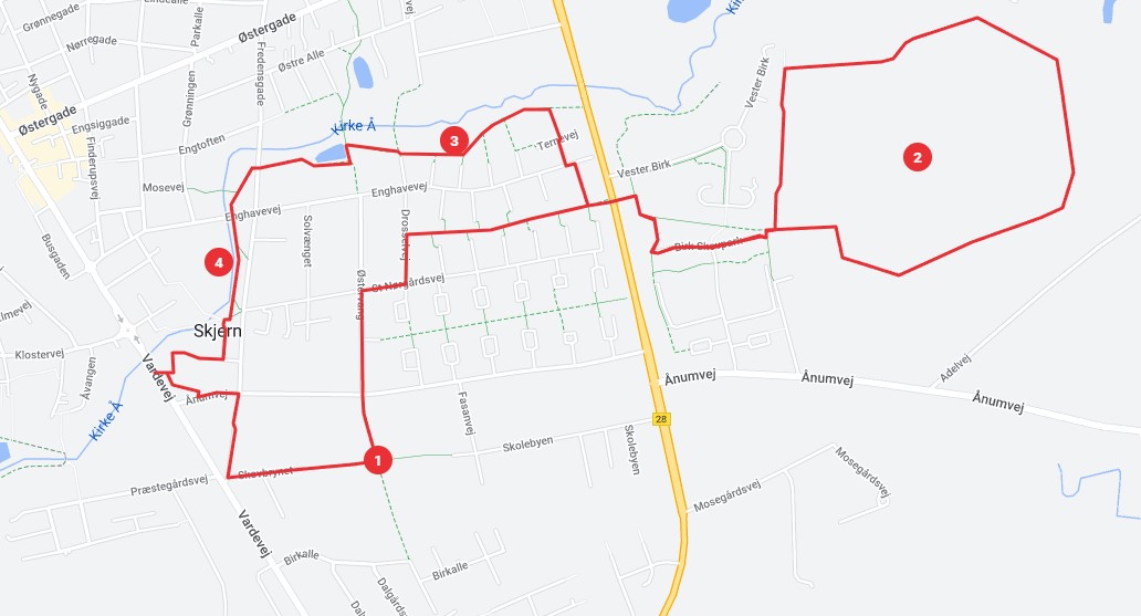 Rød rute tager dig på en hyggelig rute forbi Fredsskoven, Skjern Birk Plantage og forbi "De store plæner" og anlægget.