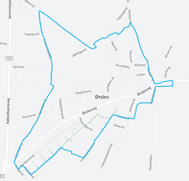Turen går rundt om Ørslev by, hvor du kan opleve byens udvikling frem til i dag med boligområder, er- hverv, skole- og fritidsliv. Du kommer forbi Eibergs Gartneri, hvor der sælges agurker, og Malteriet, hvor der produceres malt til øl- brygning. Fra industriområdet fortsætter turen sydpå ad Ugledigevej, som i gammel tid har været landevej fra Vordingborg til København. Du kommer forbi idrætsforeningen ØGIF’s klubhus og boldbanerne, som bliver brugt aktivt. Du passerer en naturlegeplads ved Albumvej med leg og bevægelse for både store og små. Turen fortsætter rundt om rækkehusene Fiskebækparken fra 1970erne og passerer det sted, hvor fattiggården lå. Til slut kommer du forbi skolen i Ørslev.